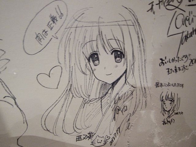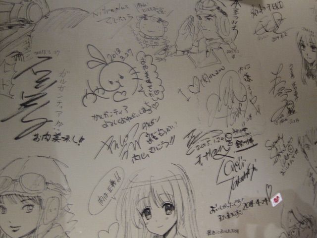 店内の壁には著名な漫画家さんの落書きがびっしりと書かれています。もうスペースが殆ど開いてないかったです。