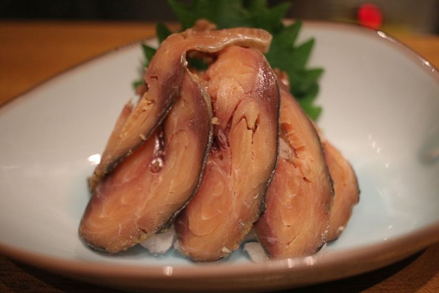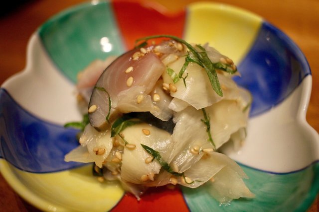 続いて、お品書きを見て気になった、〆さばガリ和え。名前そのもののお料理ですが、これが美味しいのなんの。ガリの甘酸っぱさで優しい風合いになって、普通のしめ鯖より断然いいかも。自宅でも作ってみたくなった逸品でした。