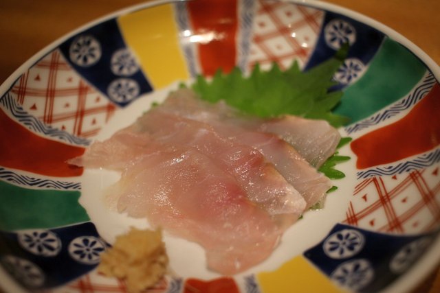 お料理は、まずは五島列島で捕れたメゴチ、メジナの刺身から。メゴチは煎り酒でいただきました。煎り酒は日本酒を煮切ったところに梅干しや昆布、鰹などで味を整えた調味料。醤油が普及するまでの日本の代表的な調味料だったそうです。煎り酒がメゴチの身の甘さを引き立たせてくれます。