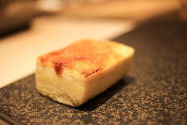 締めの玉子焼きは、表面がキャラメリゼされていて”ブリュレ風”の仕上がり。卵10個に、白身4個分のメレンゲと海老のすり身をつなぎに使っているそうです。もはや玉子焼きではなく”スイーツ”というのがふさわしい味わいでした。