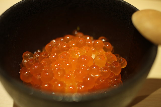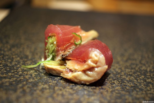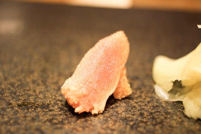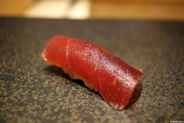 最初は握り、しかも中トロからでした。非常にきめ細やかな脂の入り方で、さすがに本物の鮨店の味わいといった感じ。なぜ最初から中トロを出されるのかお聞きしたところ、「一般的にはつまみから食べていくので、握りを出す頃にはお腹が膨れてしまうんですよね。そうしたくないので、最初から美味しいところを出すようにしているんですよ」とのこと。なるほど納得。こういったお気づかいをしていただけるのも、経験豊かなご主人だからこそかもしれません。