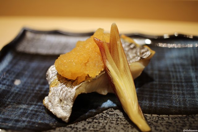塩でいただくカマスの炙り。脂が乗っているだけに、塩がピッタリです。炙りの香ばしさも良いアクセントでした。