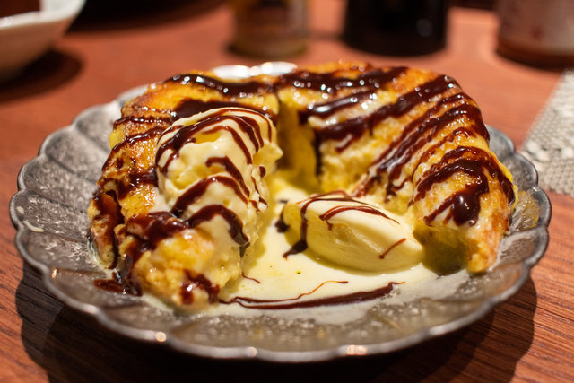 ブリオッシュはアイス添え。チョコレートソースもかけて、スイーツ好きも満足の一皿でした。