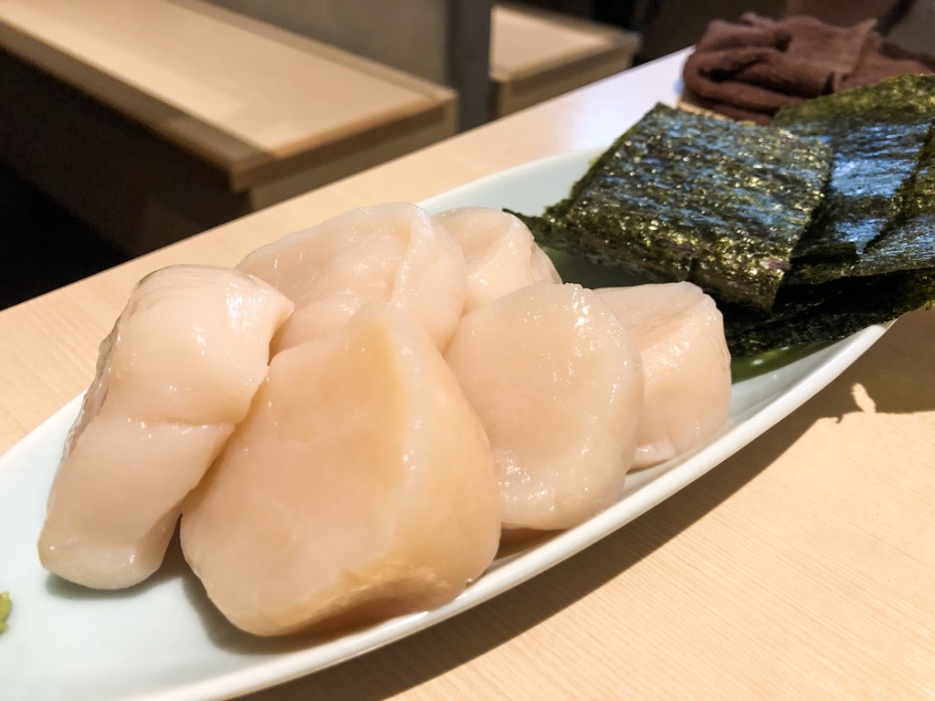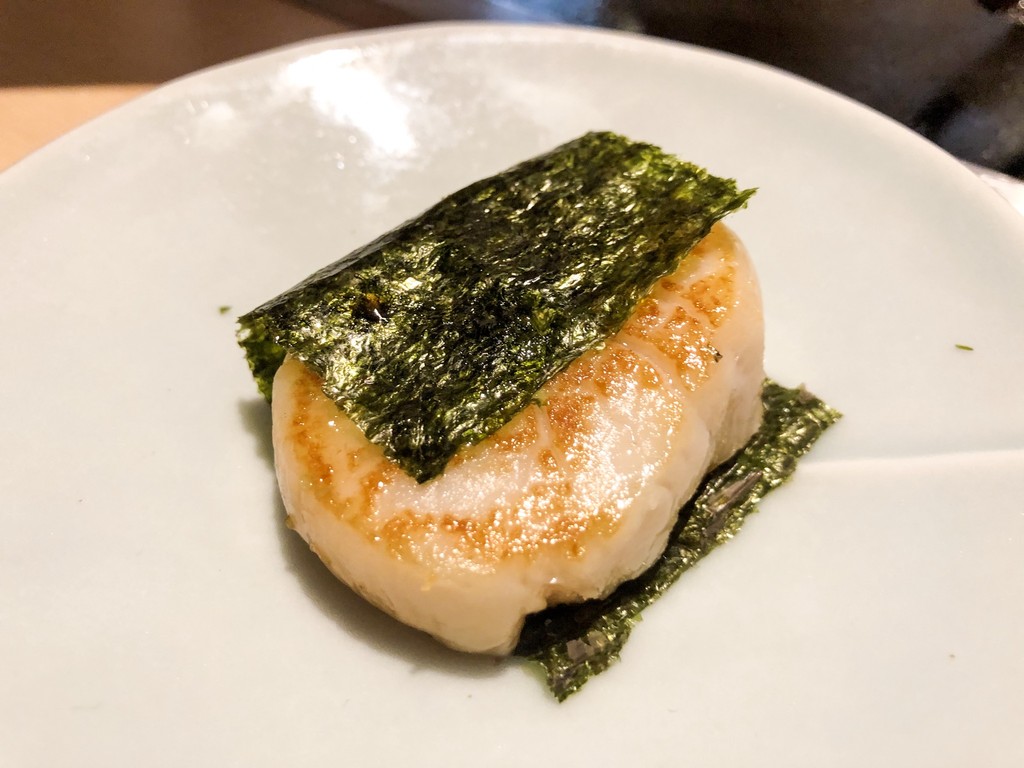 外は軽く焦げ目をつけ、中はレア気味に丁寧に焼いた後、海苔に巻いていただきました。海苔の香り、貝柱の弾力と甘みが渾然一体となって、めちゃくちゃ美味しかったです!(くうやさんでは、焼き物についてはお店の方がすべて目の前で調理してくれます)