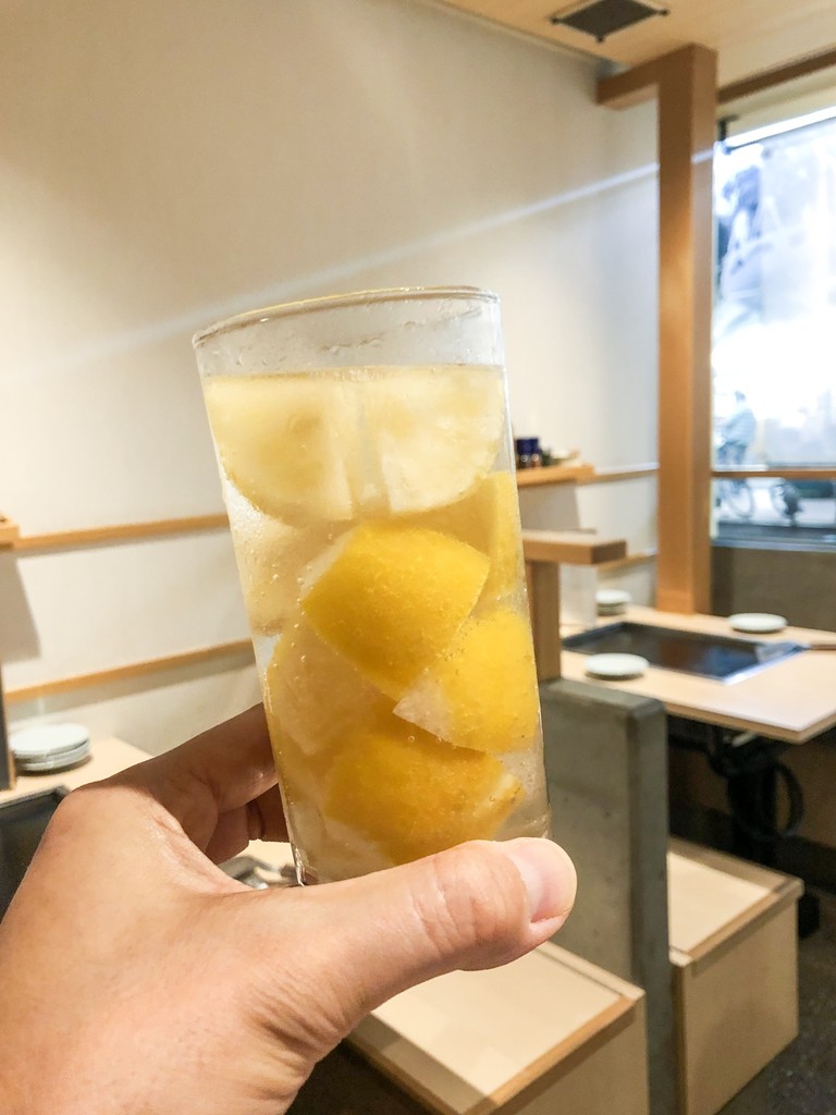 お酒のお代わりは「丸ごと檸檬」をいただきました。スライスレモンではなく、ざっくりとカットしたレモンが1個分丸々入っていました。中だけのお代わりももちろんできるので、2、3杯飲めちゃいますよ!