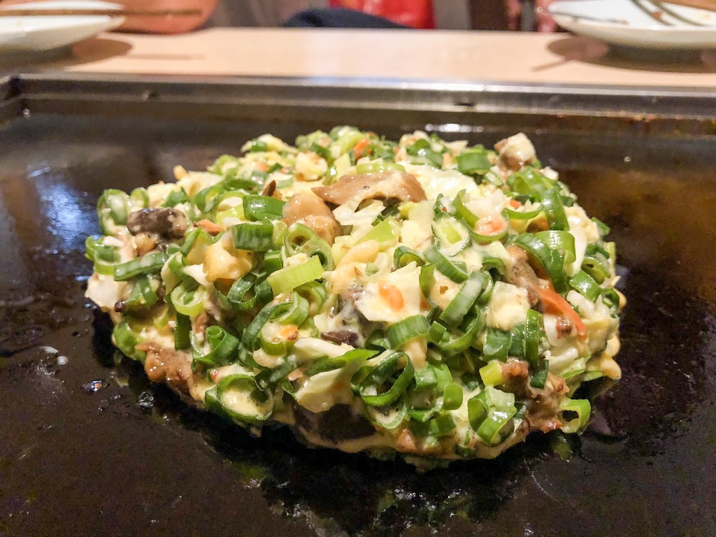 もんじゃの次はお好み焼きへ。メニューには記載されていませんでしたが、「牛すじこんにゃく」のお好み焼きを出していただきました。青ネギがたっぷりと入っていて、関西風のお好み焼きですかね。そしてこちらもだしの香り旨味が怒涛の勢いで口の中に広がり、もんじゃと同様に大変美味しかったです。