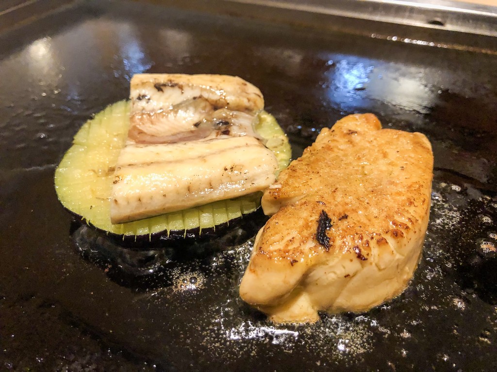 「鰹のタタキ」も自慢の一品とのことでしたが、この日はあいにく築地が休場日で入荷なし。ということで「"尾粂商店より"鰻とフォアグラと丸茄子」をいただきました。