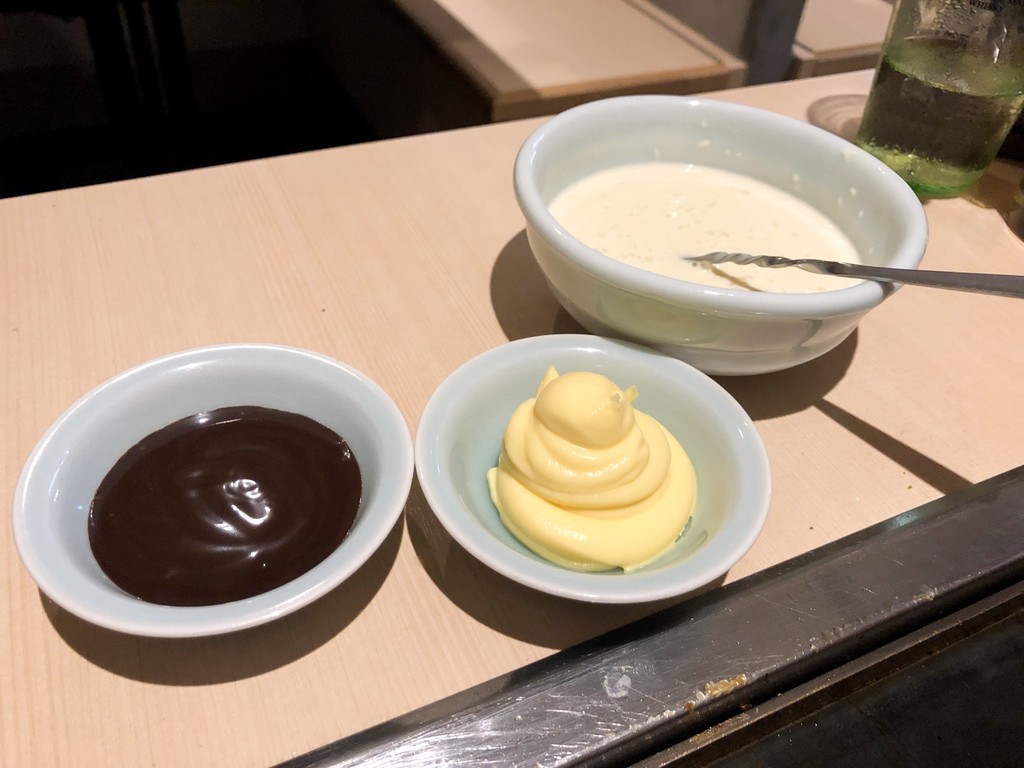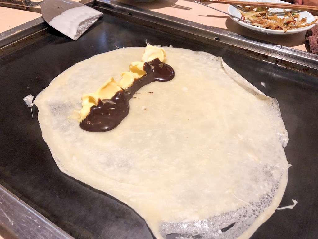 だいぶお腹も満たされたので最後はデザート。「カスタードクリームとチョコレート巻」をいただきました。クレープといっていいでしょうね。目の前で調理するので、エンタメ感満点でした!