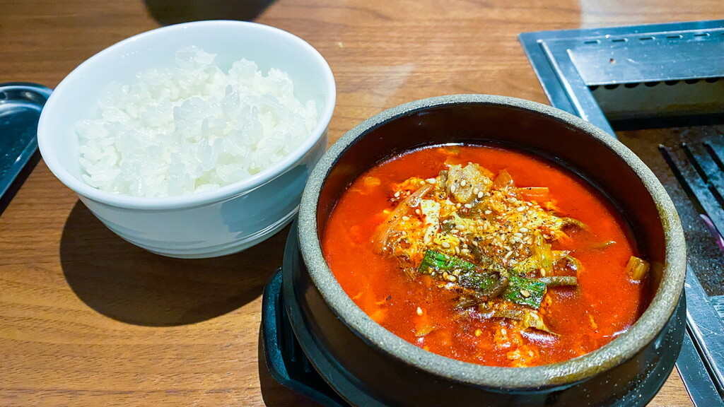 最後はユッケジャンスープに禁断のライス添えで締め。