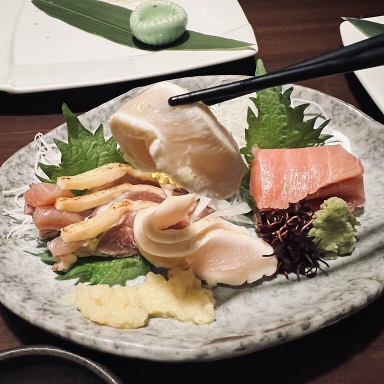 続いてお造り2点盛り。鮪と鶏たたきでした。