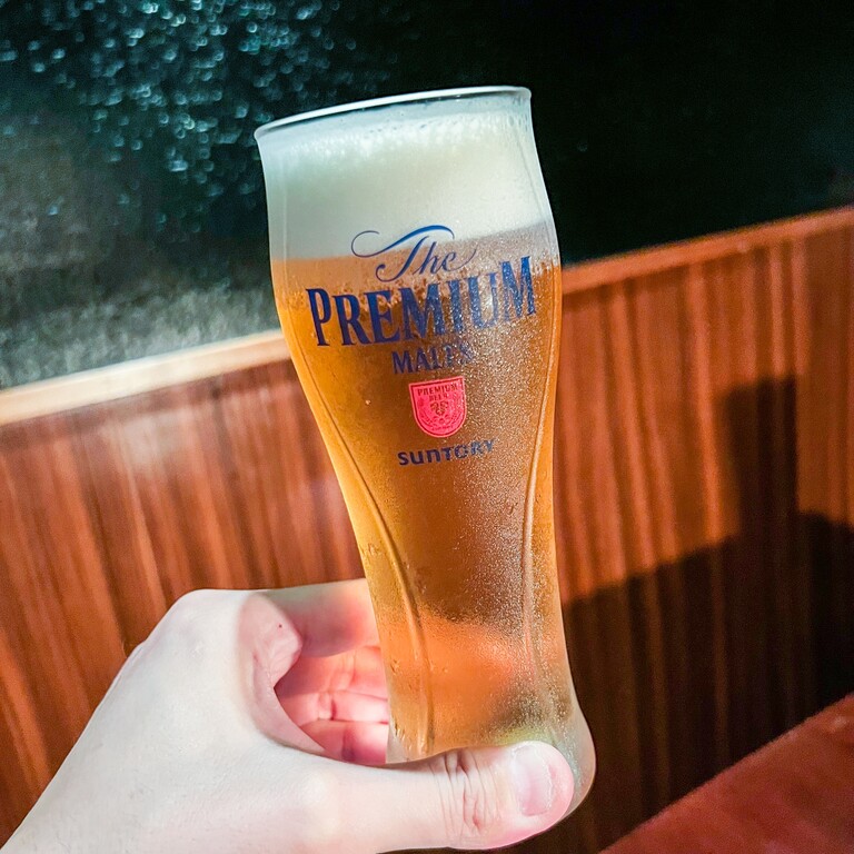 まずはビールで乾杯!神泡のプレモルうまし!