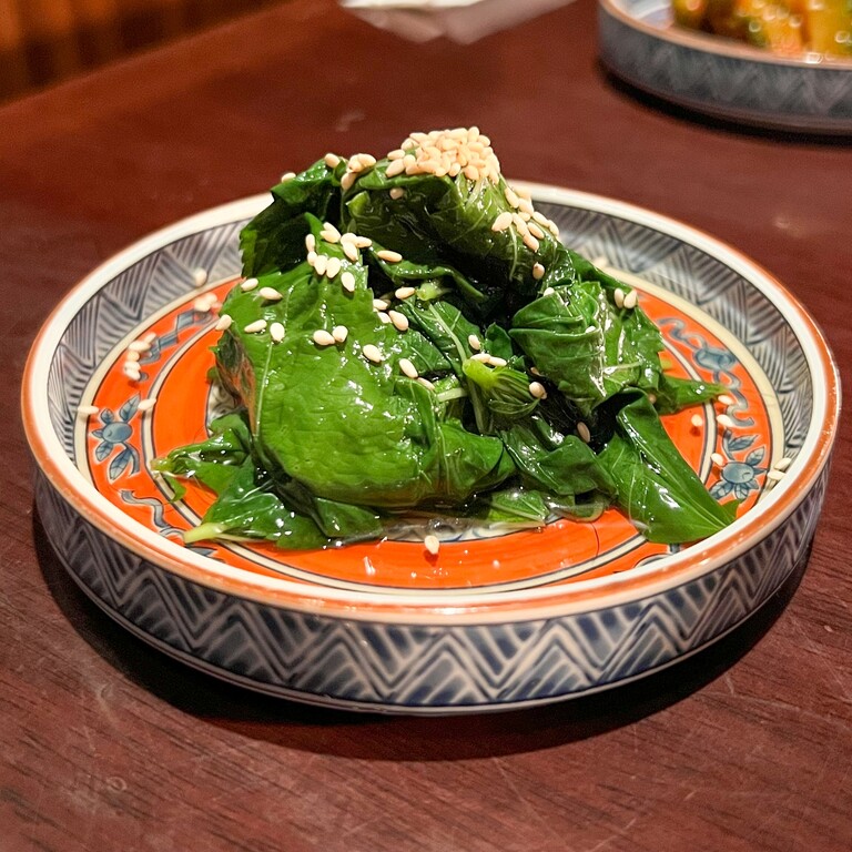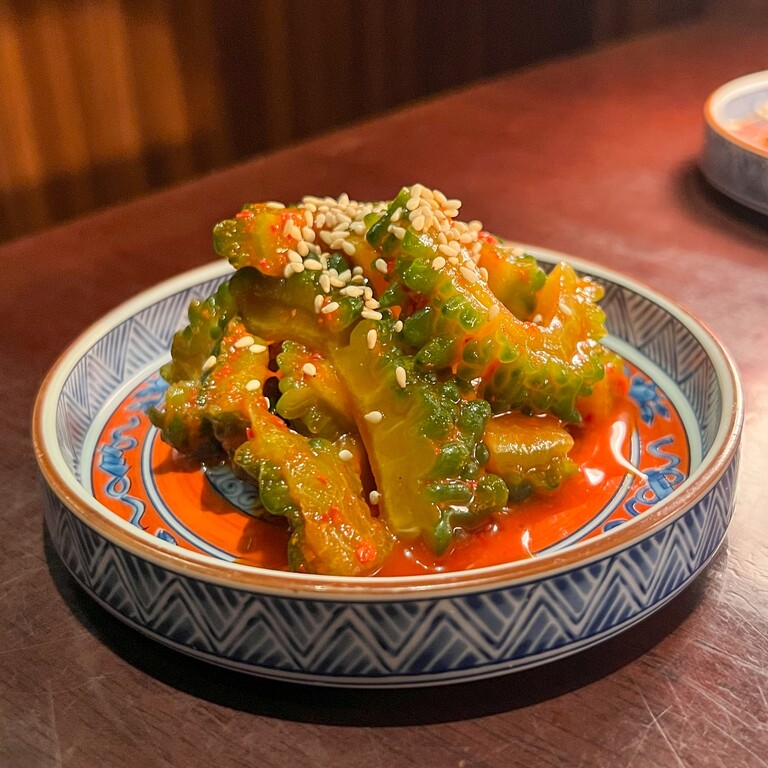 前菜は「ゴーヤのキムチ」と「モロヘイヤのお浸し」。
