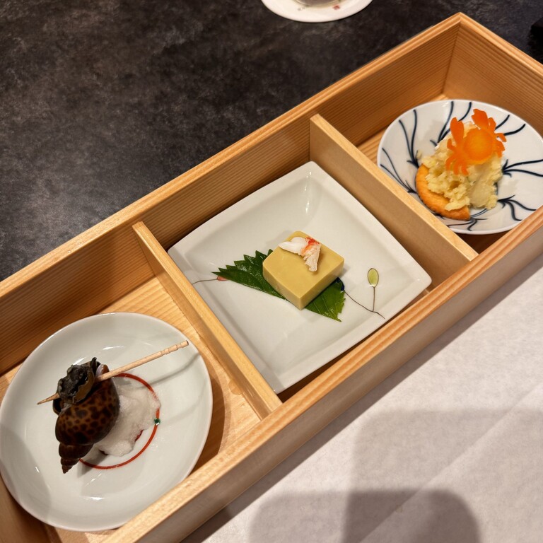 磯つぶ貝、蟹味噌入り豆腐、蟹入りポテサラの3種盛りでした。